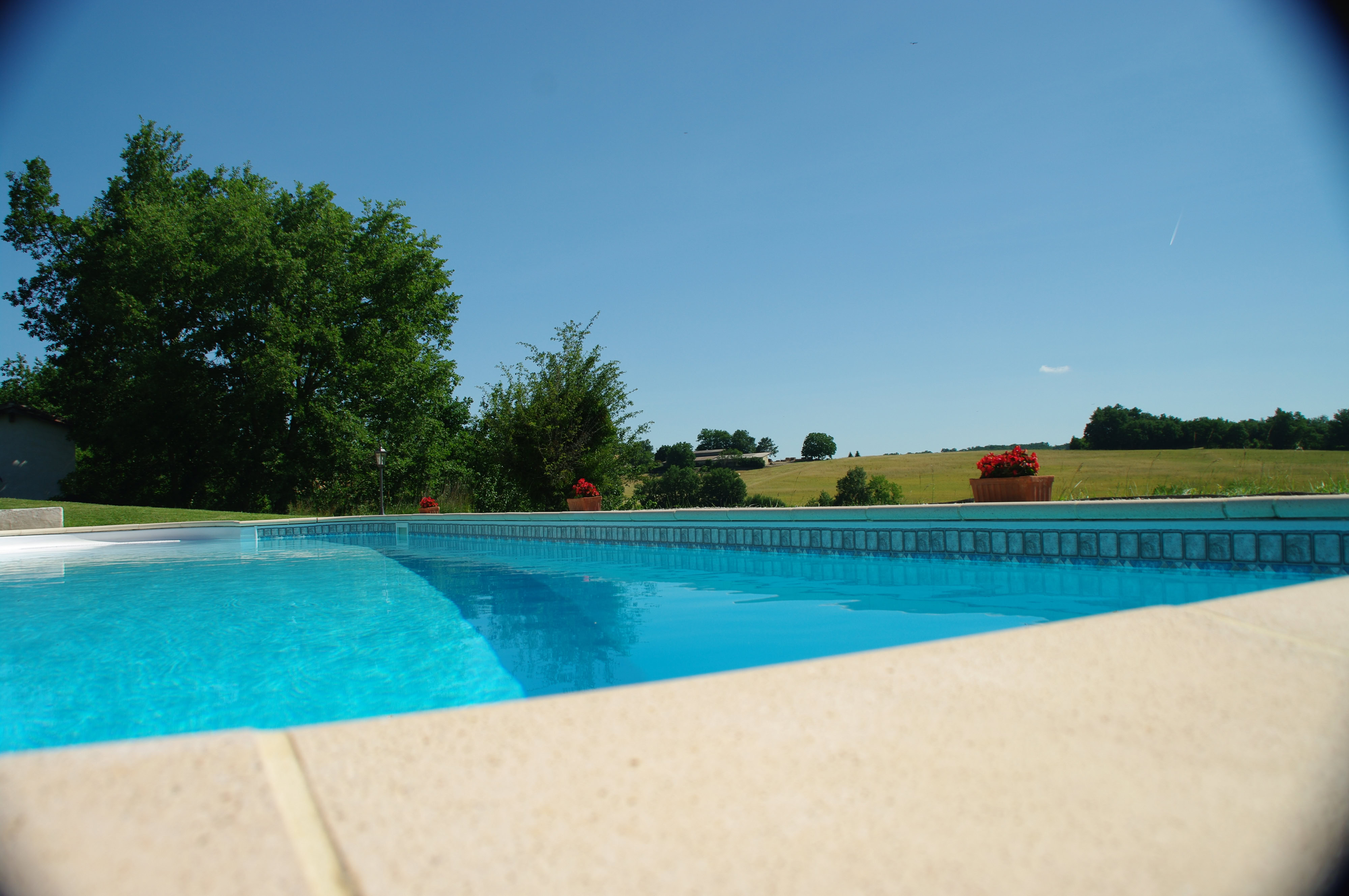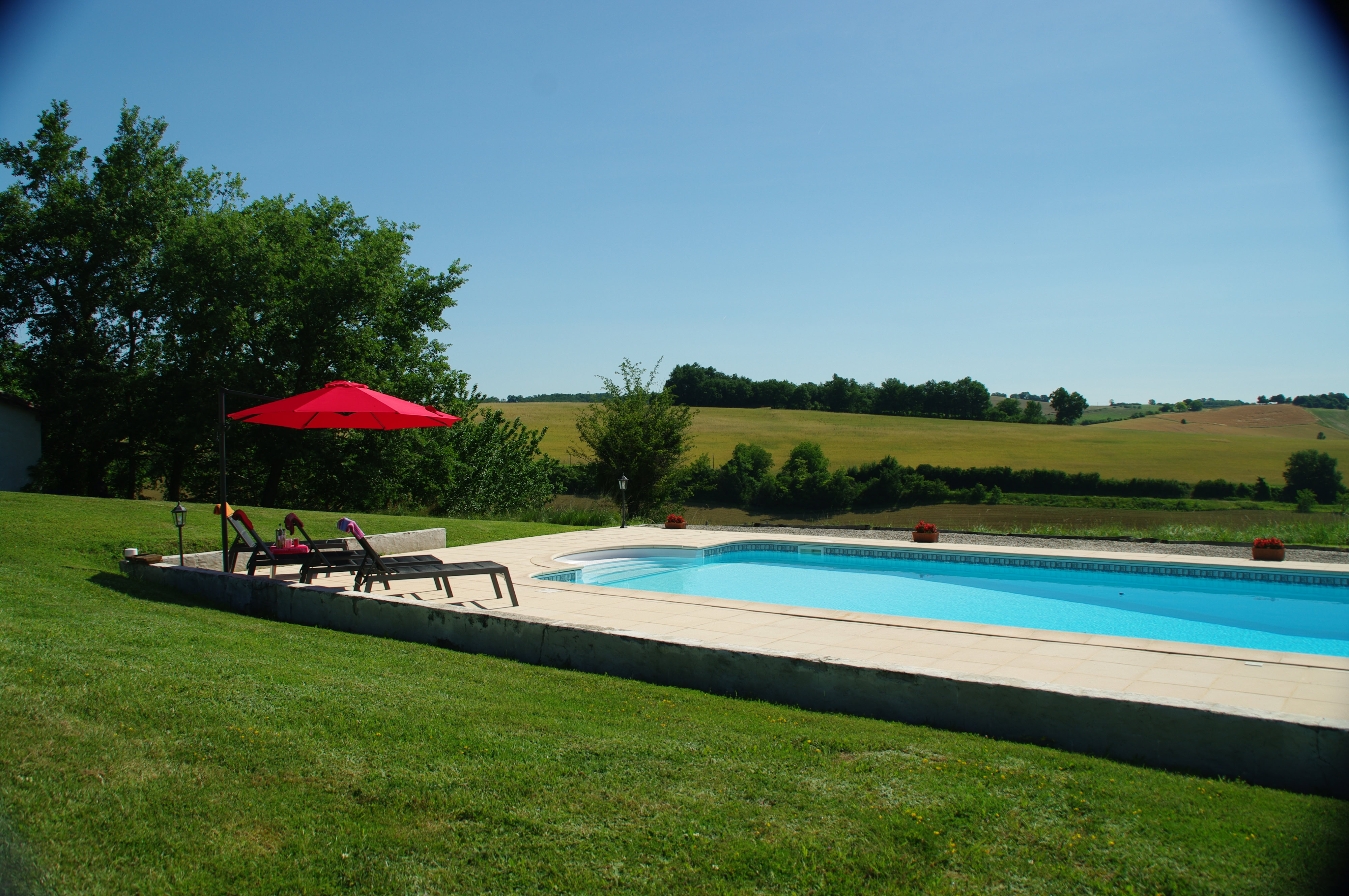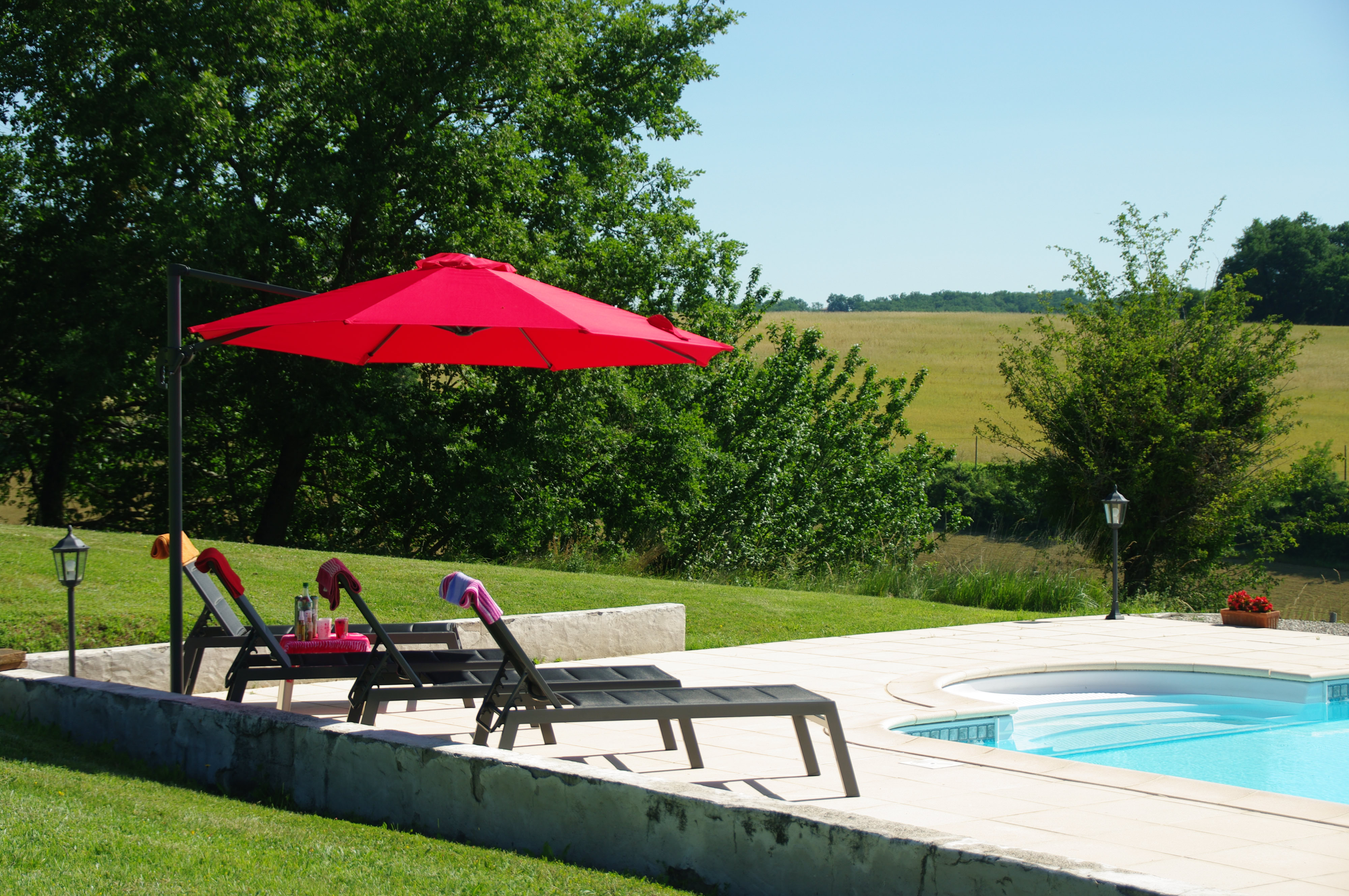 À l'extérieur, profitez d'une grande terrasse couverte avec salon de jardin, plancha et d'une jolie vue sur la piscine et la campagne vallonnée. Un très vaste jardin discret propose un boulodrome et un sauna à côté de la piscine privative (12 x 6 m, profondeur de 1 à 2,20 m, sécurisée par alarme). Parking à proximité immédiate du gîte.