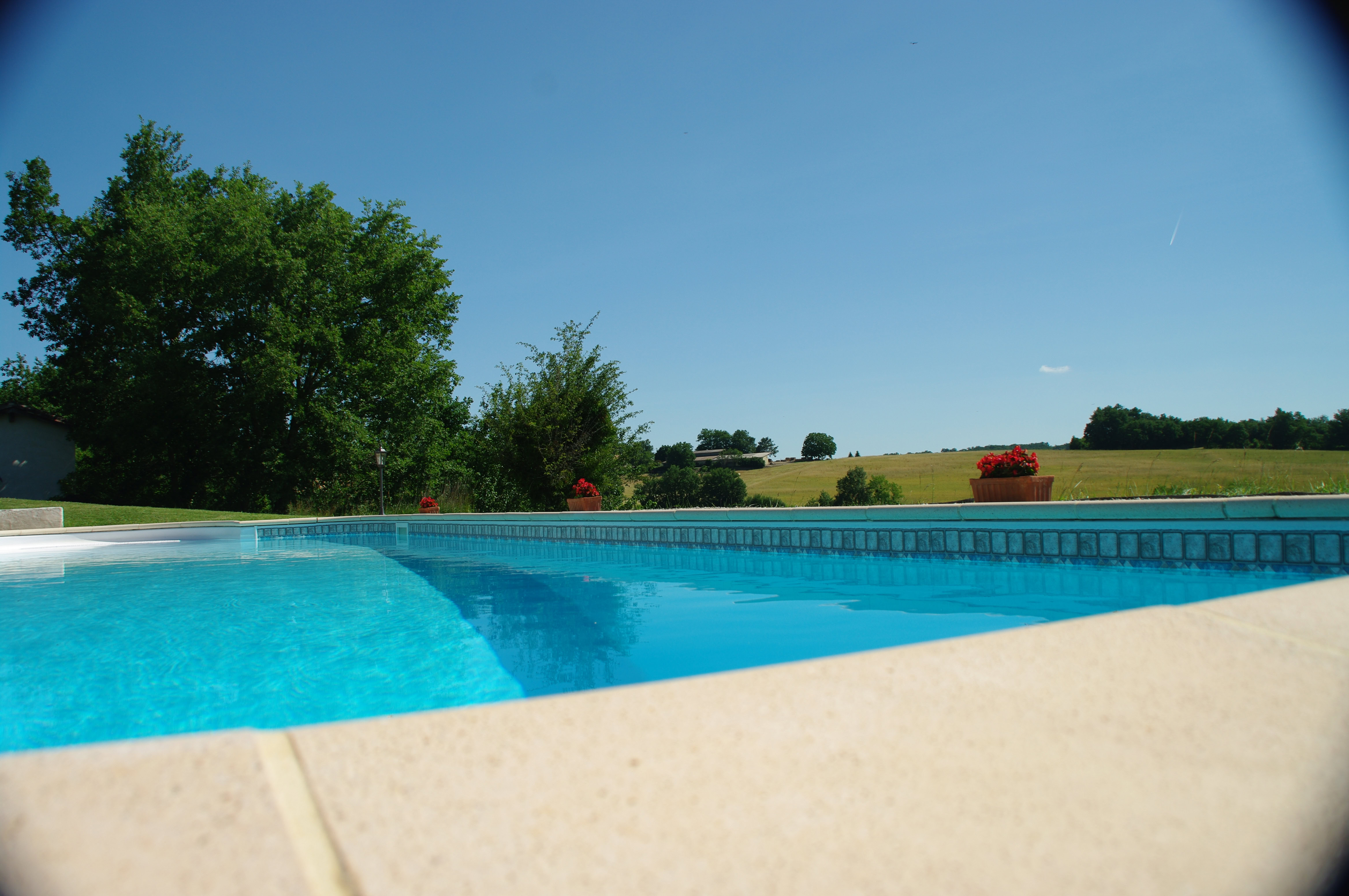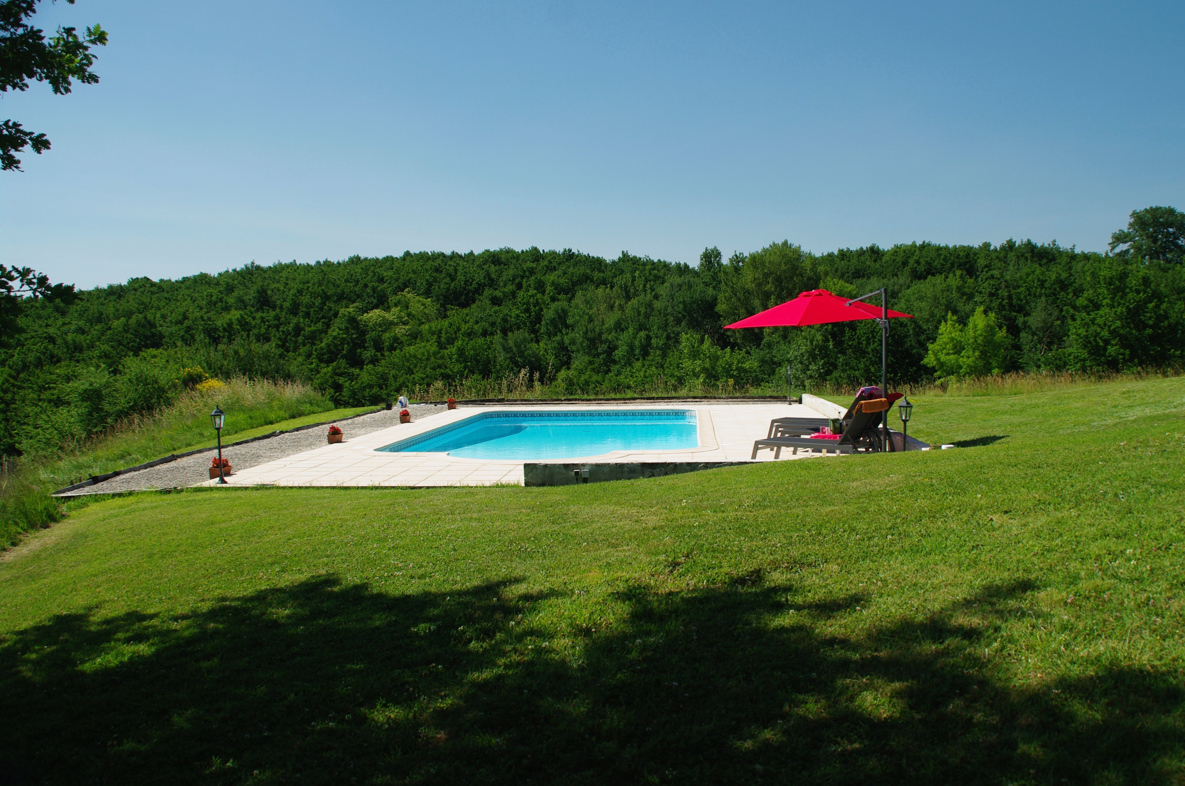 À l'extérieur, profitez d'une grande terrasse couverte avec salon de jardin, plancha et d'une jolie vue sur la piscine et la campagne vallonnée. Un très vaste jardin discret propose un boulodrome et un sauna à côté de la piscine privative (12 x 6 m, profondeur de 1 à 2,20 m, sécurisée par alarme). Parking à proximité immédiate du gîte.